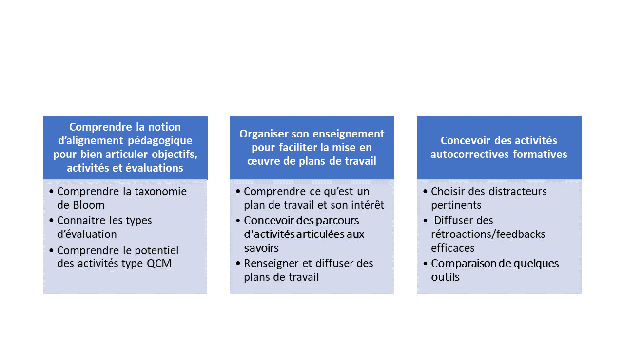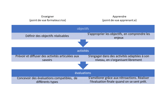 Ces trois axes (objectifs, activités, évaluations) doivent être cohérents, c'est la notion d'alignement pédagogique.